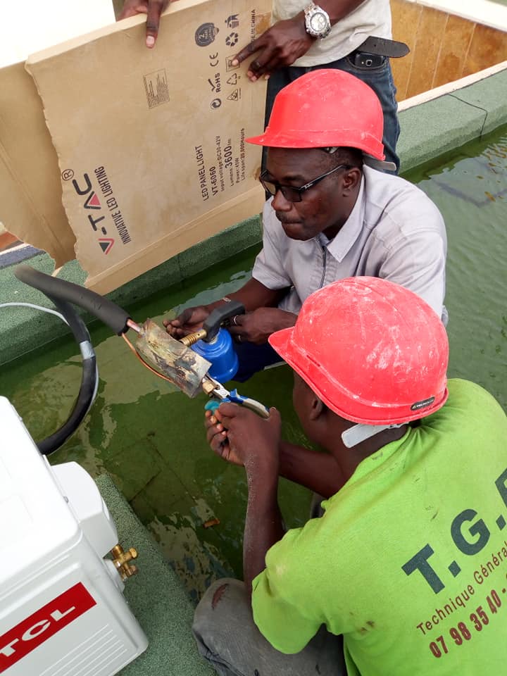 Aujourd’hui, 23 ans qu’elle est installée dans la région d’Abidjan avec un responsable qui a 31 ans d’expérience dans le domaine dont le formateur principale est un franco-chinois .Elle est spécialisée dans le domaine de la réfrigération, climatisation, installation de cuisines professionnelles, électricité bâtiment… Réactive et dynamique, notre équipe de professionnels qualifiés est à votre disposition afin de solutionner rapidement vos besoins. Elle étudie, installe et entretient les systèmes de climatisation, plancher chauffant / rafraîchissant, chauffe-eau et bien sûr les chaudières. Nous apportons tous nos soins à une installation soignée, propre et réalisée dans les délais les plus courts.. Nous vous apportons un conseil personnalisé et nous vous garantissons le meilleur rapport qualité prix. Avec le temps TGF a gagné la confiance de certaines clients. Tel que les certaines ambassades, sociétés, restaurants, pharmacies et de grandes personnalités. Vous êtes donc un particulier ou Professionnel, Faite confiance à notre équipe. Car elle saura vous guider et vous conseiller dans vos choix tout en respectant votre budget.